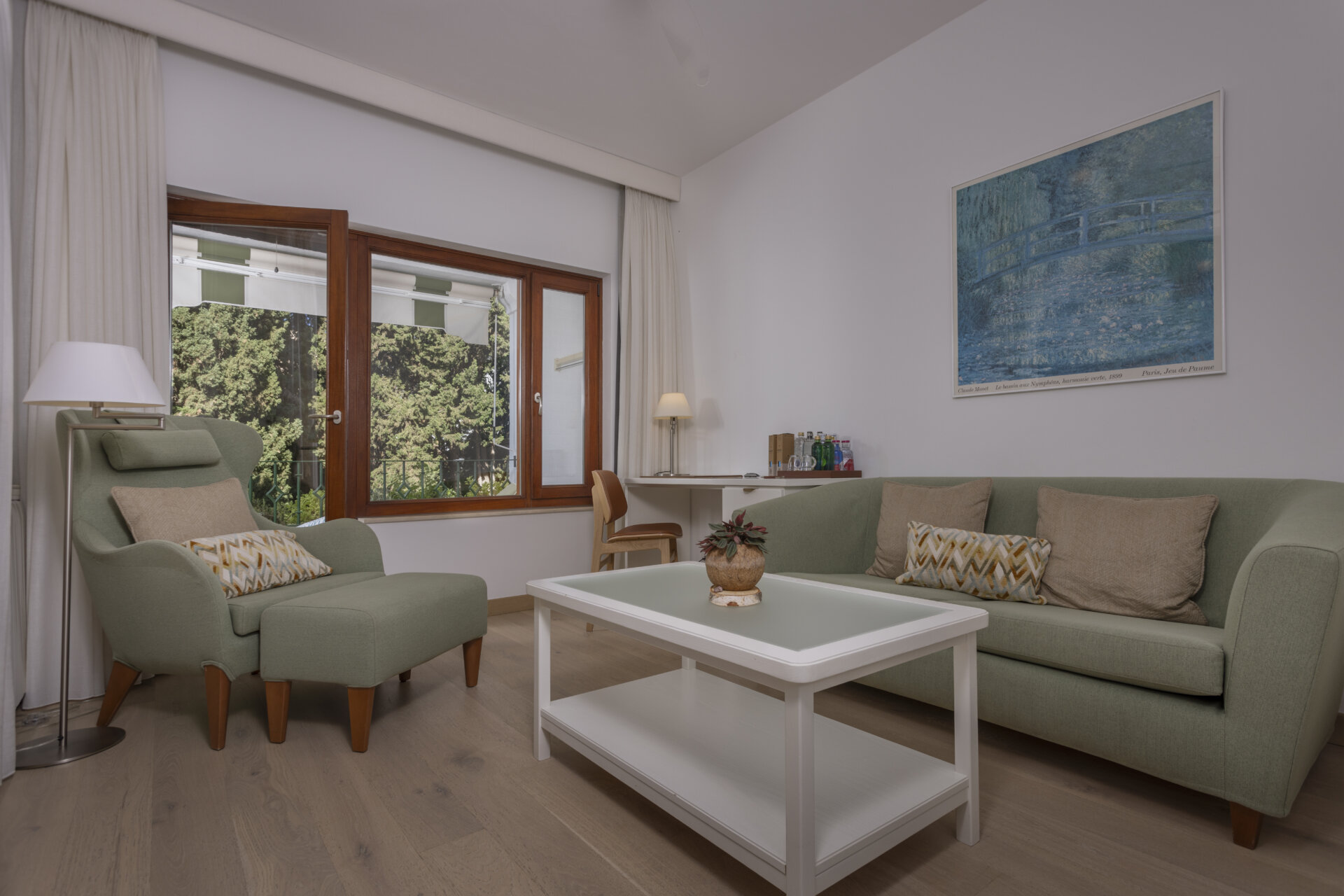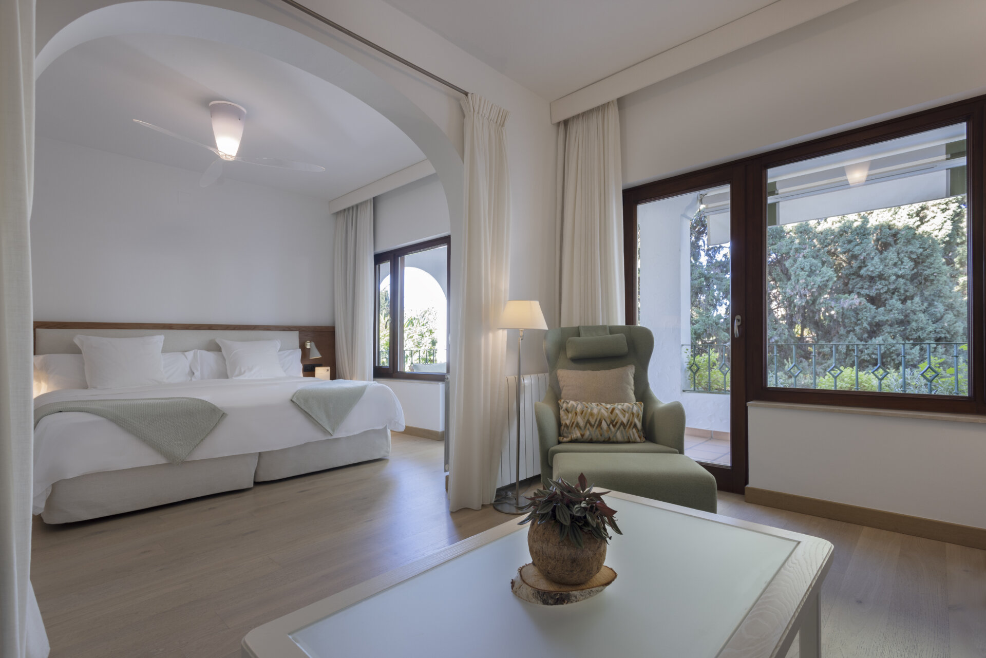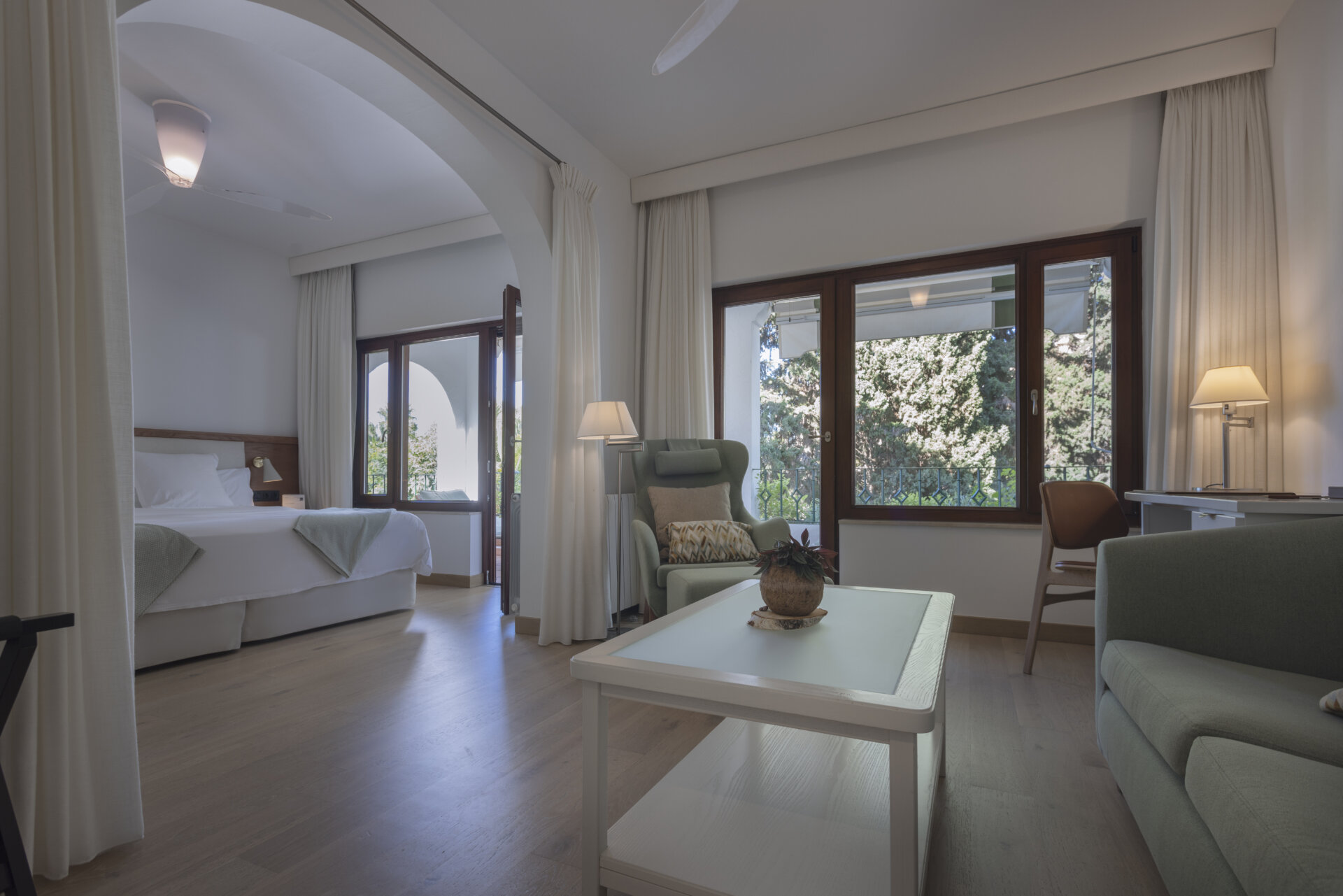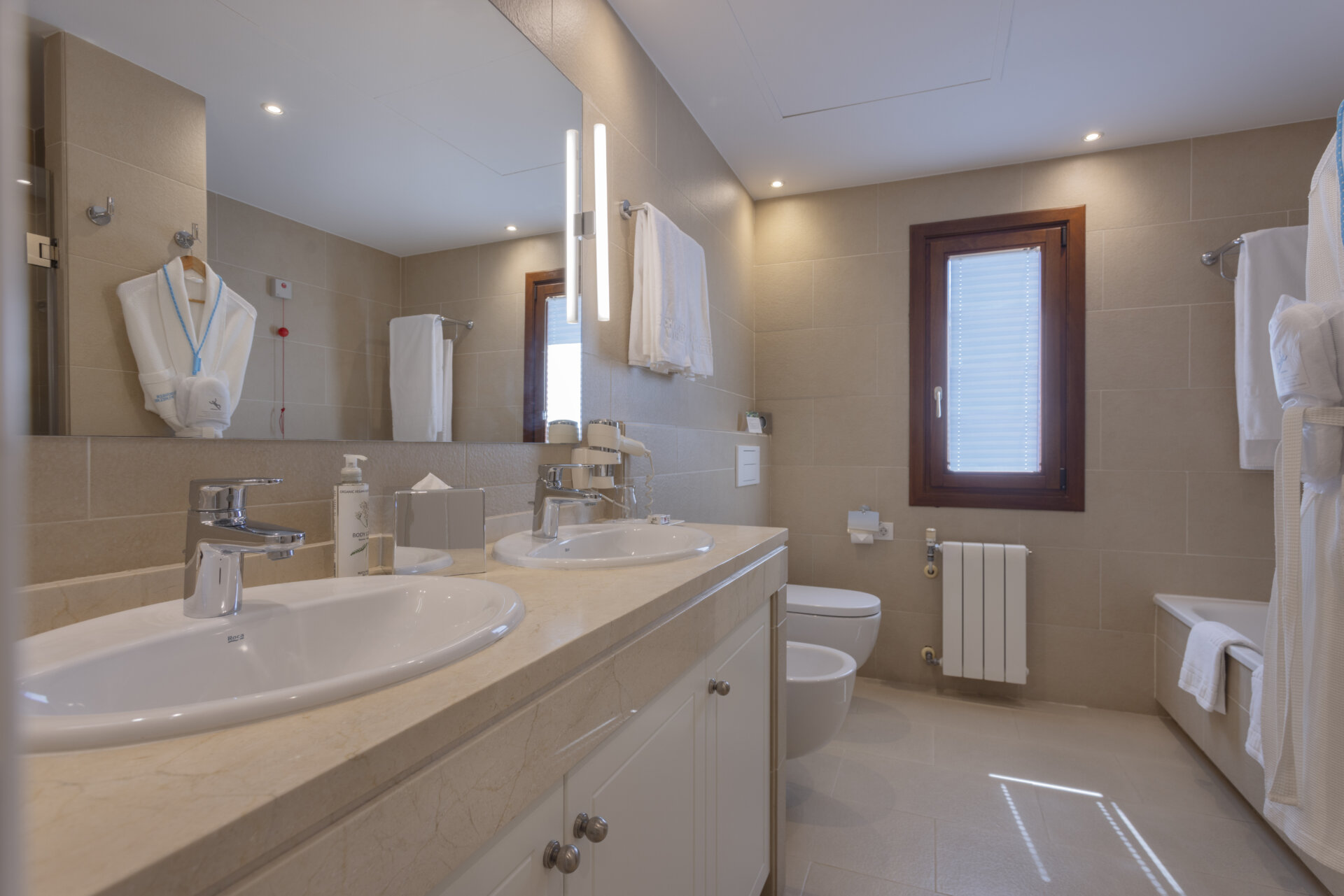 Zimmer mit Westausrichtung, ca. 32–38 m² sowie Terrasse (11 m²), Doppelbett 210 × 200 cm, Badezimmer mit Badewanne und Dusche, WC und Bidet.